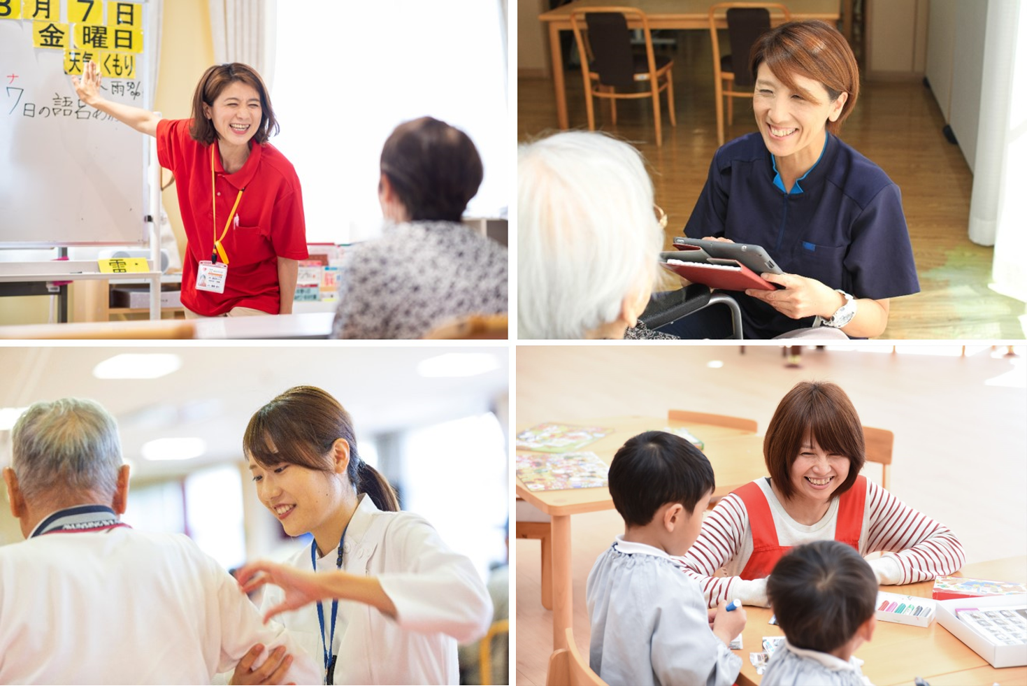 | 求人票 | ①ドライバー(パート) ②介護支援専門員(フルタイム) ➂事務員(フルタイム) ④厨房スタッフ(パート) ⑤保育士(フルタイム) ⑥訪問介護士(パート) ⑦訪問介護士(フルタイム) ⑧訪問看護師(フルタイム) ⑨訪問看護師管理者候補 |