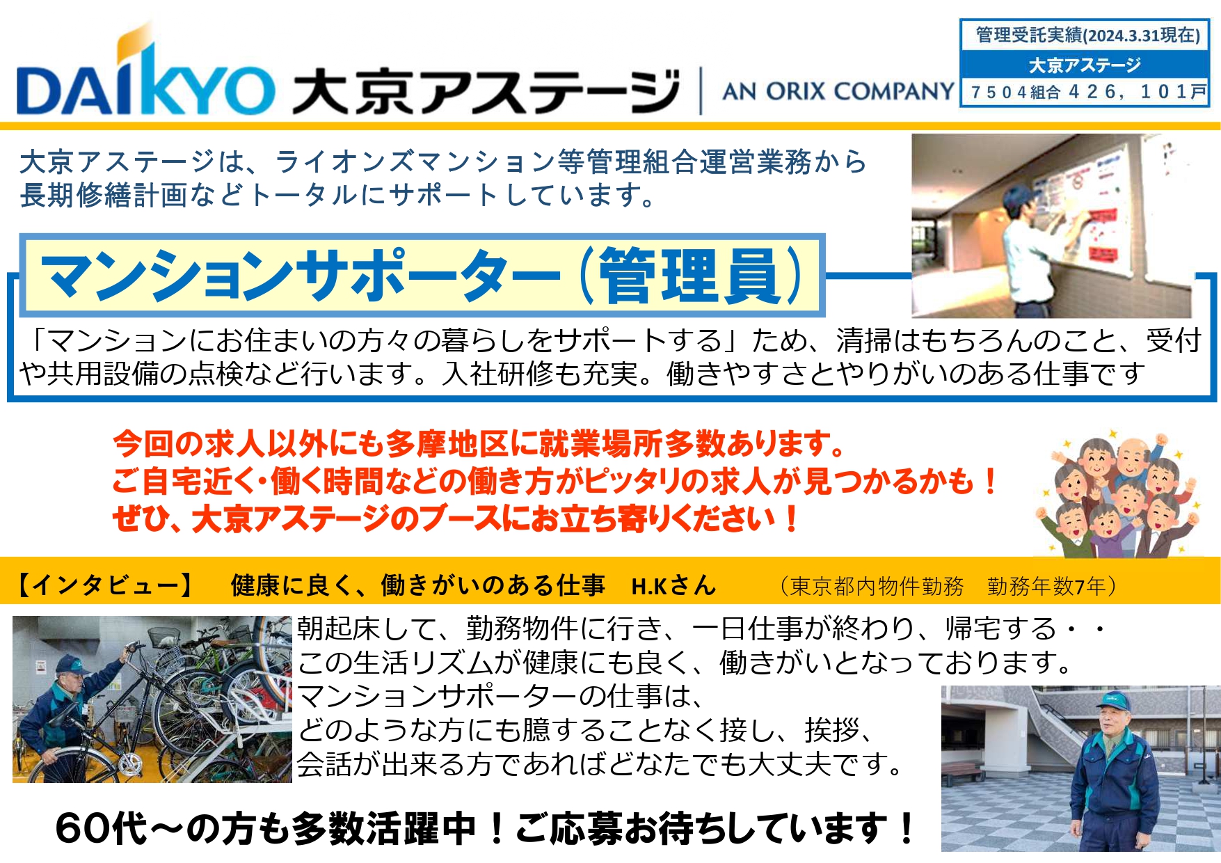 募集は、マンションサポーター(管理員)であり、お住まいの方々の暮らしをサポートするため、清掃、受付や共用設備の点検など行います。入社研修も充実。働きやすさとやりがいのある仕事です。